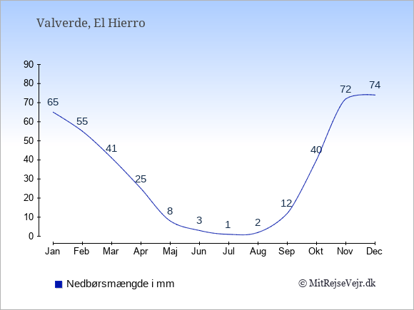 Se klimadata for Valverde sammenlignet med klimaet i Danmark.