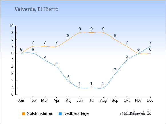 Graferne viser det gennemsnitlige antal solskinstimer i Valverde pr. dag samt det gennemsnitlige antal dage med nedbør i Valverde sammenlignet med København.