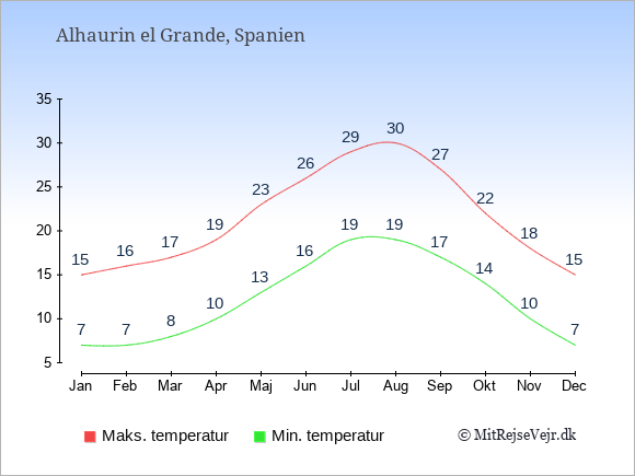 Grafen viser de gennemsnitlige maksimale temperaturer i Alhaurin el Grande (som oftest den værdi, der er målt midt på dagen) og de gennemsnitlige minimale temperaturer (som oftest den værdi, der er målt midt om natten).