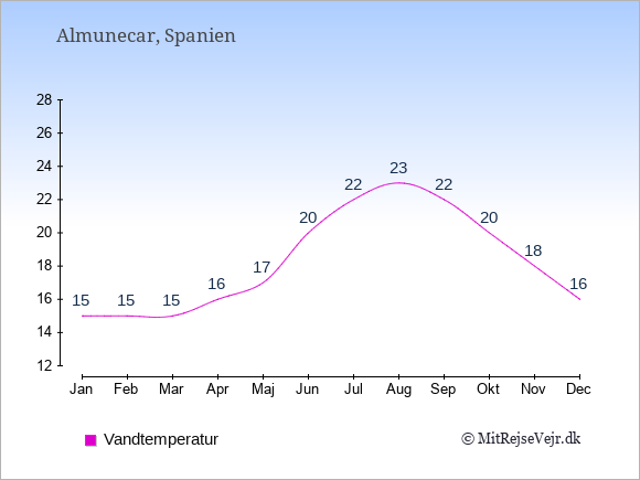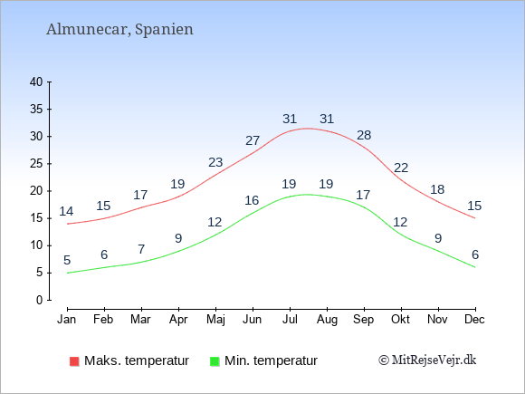 Grafen viser de gennemsnitlige maksimale temperaturer i Almunecar (som oftest den værdi, der er målt midt på dagen) og de gennemsnitlige minimale temperaturer (som oftest den værdi, der er målt midt om natten).