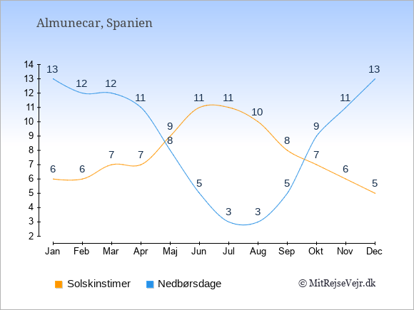 Grafen viser antallet af solskinstimer i Almunecar (d.v.s. det gennemsnitlige antal timer pr. dag hvor solen skinner), samt antallet af nedbørsdage (d.v.s. det gennemsnitlige antal dage i en given måned,