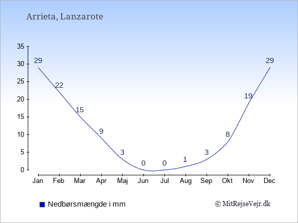 Vejret i Arrieta er som regel bedst i de måneder, hvor der er mange solskinstimer og få nedbørsdage.