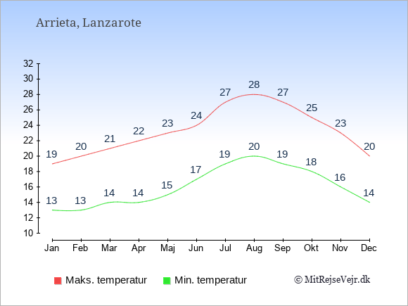 Grafen viser de gennemsnitlige maksimale temperaturer i Arrieta (som oftest den værdi, der er målt midt på dagen) og de gennemsnitlige minimale temperaturer (som oftest den værdi, der er målt midt om natten).