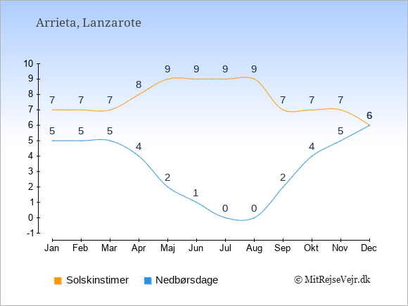 Grafen viser antallet af solskinstimer i Arrieta (d.v.s. det gennemsnitlige antal timer pr. dag hvor solen skinner), samt antallet af nedbørsdage (d.v.s. det gennemsnitlige antal dage i en given måned,