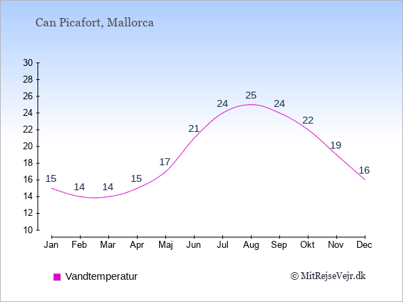 Grafen viser de gennemsnitlige maksimale temperaturer i Can Picafort (som oftest den værdi, der er målt midt på dagen) og de gennemsnitlige minimale temperaturer (som oftest den værdi, der er målt midt om natten).