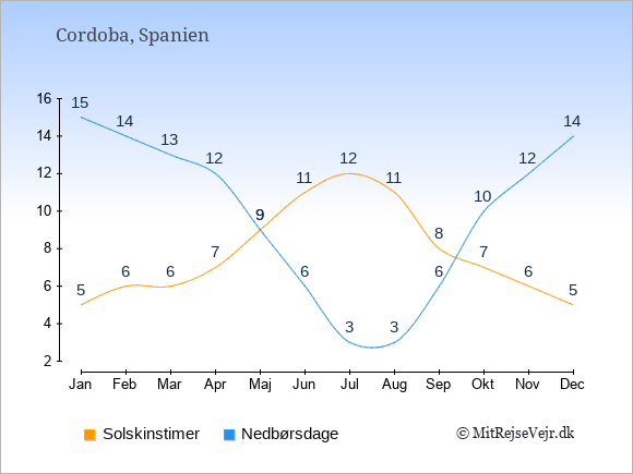 Grafen viser antallet af solskinstimer i Cordoba (d.v.s. det gennemsnitlige antal timer pr. dag hvor solen skinner), samt antallet af nedbørsdage (d.v.s. det gennemsnitlige antal dage i en given måned,
