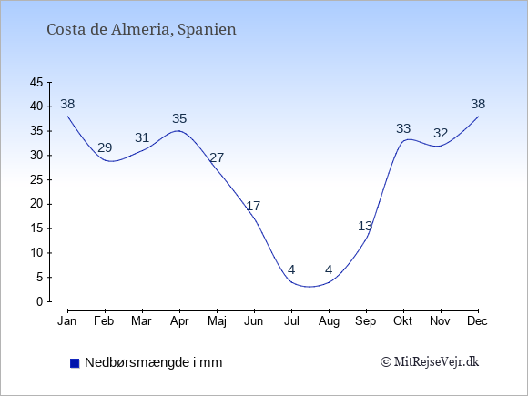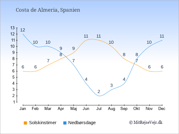 Grafen viser antallet af solskinstimer i Costa de Almeria (d.v.s. det gennemsnitlige antal timer pr. dag hvor solen skinner), samt antallet af nedbørsdage (d.v.s. det gennemsnitlige antal dage i en given måned,