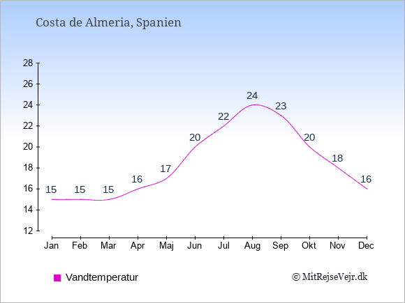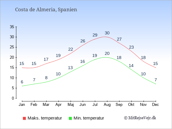 Grafen viser de gennemsnitlige maksimale temperaturer i Costa de Almeria (som oftest den værdi, der er målt midt på dagen) og de gennemsnitlige minimale temperaturer (som oftest den værdi, der er målt midt om natten).