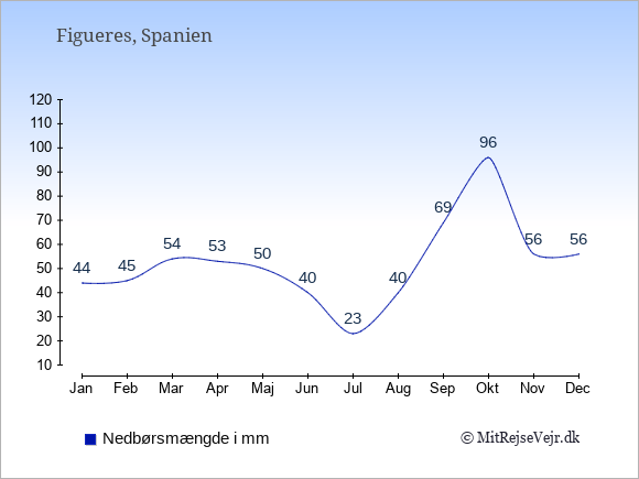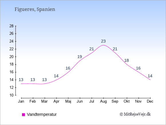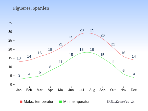 Grafen viser de gennemsnitlige maksimale temperaturer i Figueres (som oftest den værdi, der er målt midt på dagen) og de gennemsnitlige minimale temperaturer (som oftest den værdi, der er målt midt om natten).