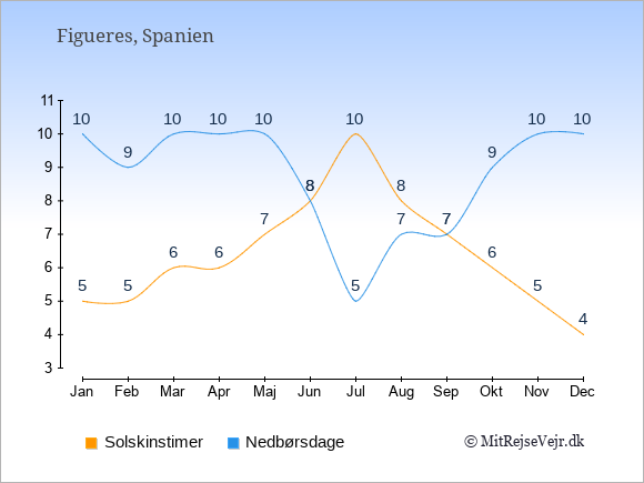 Grafen viser antallet af solskinstimer i Figueres (d.v.s. det gennemsnitlige antal timer pr. dag hvor solen skinner), samt antallet af nedbørsdage (d.v.s. det gennemsnitlige antal dage i en given måned,