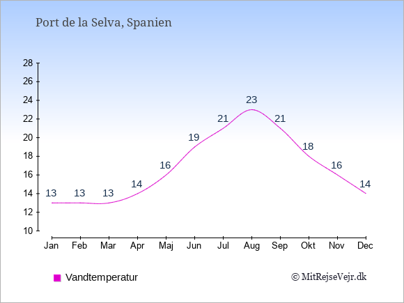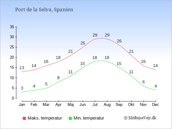 Grafen viser de gennemsnitlige maksimale temperaturer i Port de la Selva (som oftest den værdi, der er målt midt på dagen) og de gennemsnitlige minimale temperaturer (som oftest den værdi, der er målt midt om natten).