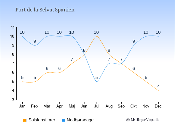 Grafen viser antallet af solskinstimer i Port de la Selva (d.v.s. det gennemsnitlige antal timer pr. dag hvor solen skinner), samt antallet af nedbørsdage (d.v.s. det gennemsnitlige antal dage i en given måned,