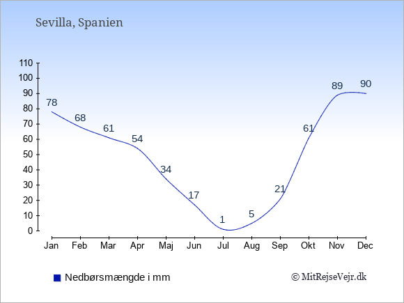 Vejret i Sevilla: Solskinstimer og nedbørsdage