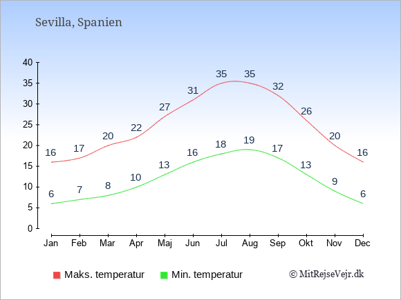 Grafen viser de gennemsnitlige maksimale temperaturer i Sevilla (som oftest den værdi, der er målt midt på dagen) og de gennemsnitlige minimale temperaturer (som oftest den værdi, der er målt midt om natten).