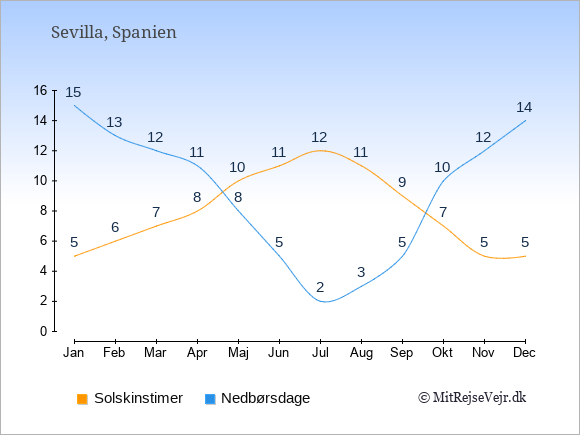 Grafen viser antallet af solskinstimer i Sevilla (d.v.s. det gennemsnitlige antal timer pr. dag hvor solen skinner), samt antallet af nedbørsdage (d.v.s. det gennemsnitlige antal dage i en given måned,