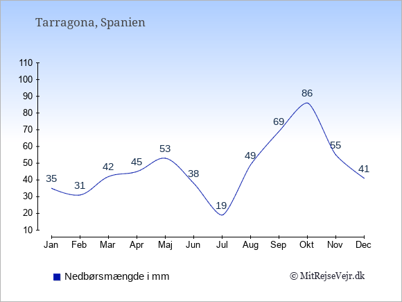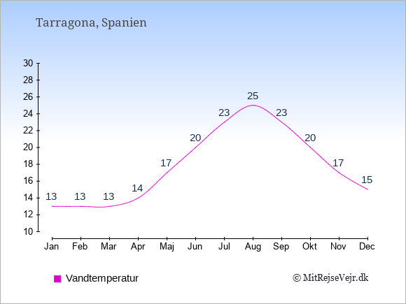 Grafen viser de gennemsnitlige maksimale temperaturer i Tarragona (som oftest den værdi, der er målt midt på dagen) og de gennemsnitlige minimale temperaturer (som oftest den værdi, der er målt midt om natten).