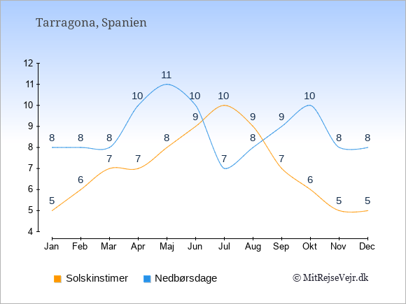Grafen viser antallet af solskinstimer i Tarragona (d.v.s. det gennemsnitlige antal timer pr. dag hvor solen skinner), samt antallet af nedbørsdage (d.v.s. det gennemsnitlige antal dage i en given måned,