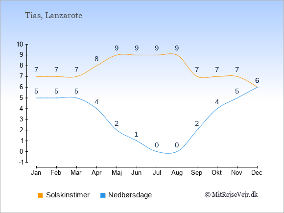 Grafen viser antallet af solskinstimer i Tias (d.v.s. det gennemsnitlige antal timer pr. dag hvor solen skinner), samt antallet af nedbørsdage (d.v.s. det gennemsnitlige antal dage i en given måned,