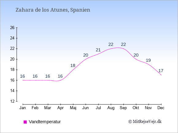 Grafen viser de gennemsnitlige maksimale temperaturer i Zahara de los Atunes (som oftest den værdi, der er målt midt på dagen) og de gennemsnitlige minimale temperaturer (som oftest den værdi, der er målt midt om natten).