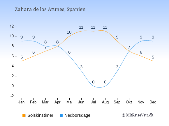 Grafen viser antallet af solskinstimer i Zahara de los Atunes (d.v.s. det gennemsnitlige antal timer pr. dag hvor solen skinner), samt antallet af nedbørsdage (d.v.s. det gennemsnitlige antal dage i en given måned,
