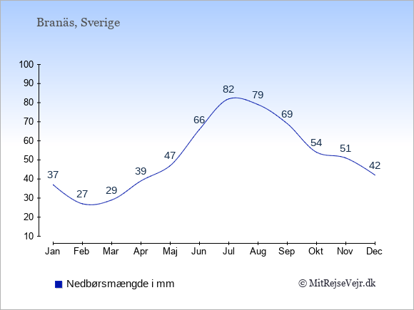 Se klimadata for Branäs sammenlignet med klimaet i Danmark.
