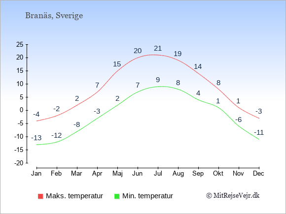 Graferne viser de gennemsnitlige maksimale temperaturer i Branäs og København (typisk når solen står højest på himmelen om eftermiddagen) og de gennemsnitlige minimale temperaturer (typisk den laveste temperatur som måles om natten).