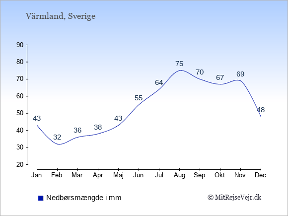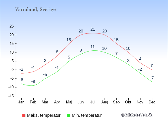 Grafen viser de gennemsnitlige maksimale temperaturer i Värmland (som oftest den værdi, der er målt midt på dagen) og de gennemsnitlige minimale temperaturer (som oftest den værdi, der er målt midt om natten).