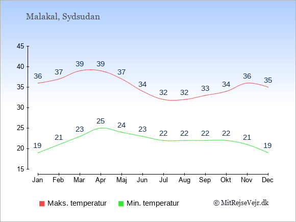 Grafen viser de gennemsnitlige maksimale temperaturer i Malakal (som oftest den værdi, der er målt midt på dagen) og de gennemsnitlige minimale temperaturer (som oftest den værdi, der er målt midt om natten).