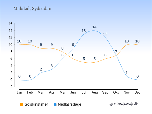 Grafen viser antallet af solskinstimer i Malakal (d.v.s. det gennemsnitlige antal timer pr. dag hvor solen skinner), samt antallet af nedbørsdage (d.v.s. det gennemsnitlige antal dage i en given måned,