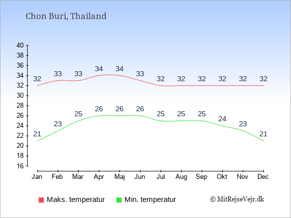 Grafen viser de gennemsnitlige maksimale temperaturer i Chon Buri (som oftest den værdi, der er målt midt på dagen) og de gennemsnitlige minimale temperaturer (som oftest den værdi, der er målt midt om natten).