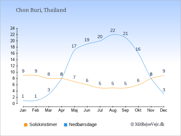 Grafen viser antallet af solskinstimer i Chon Buri (d.v.s. det gennemsnitlige antal timer pr. dag hvor solen skinner), samt antallet af nedbørsdage (d.v.s. det gennemsnitlige antal dage i en given måned,