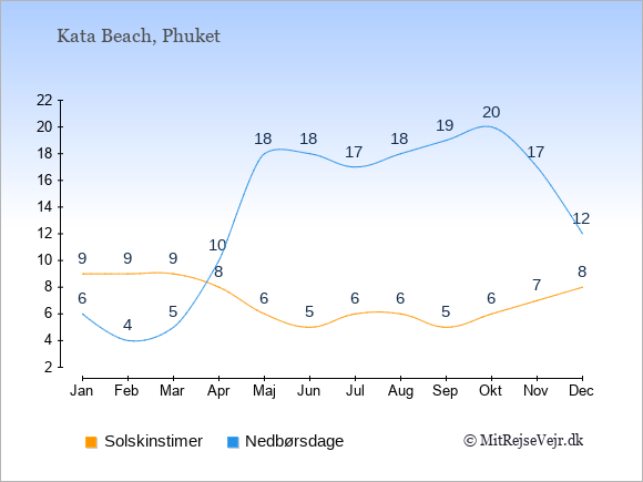 Grafen viser antallet af solskinstimer i Kata Beach (d.v.s. det gennemsnitlige antal timer pr. dag hvor solen skinner), samt antallet af nedbørsdage (d.v.s. det gennemsnitlige antal dage i en given måned,