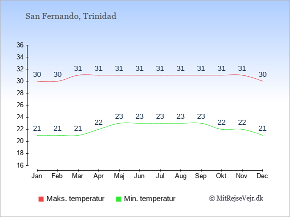 Graferne viser de gennemsnitlige maksimale temperaturer i San Fernando og København (typisk når solen står højest på himmelen om eftermiddagen) og de gennemsnitlige minimale temperaturer (typisk den laveste temperatur som måles om natten).
