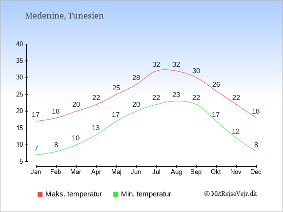 Graferne viser de gennemsnitlige maksimale temperaturer i Medenine og København (typisk når solen står højest på himmelen om eftermiddagen) og de gennemsnitlige minimale temperaturer (typisk den laveste temperatur som måles om natten).
