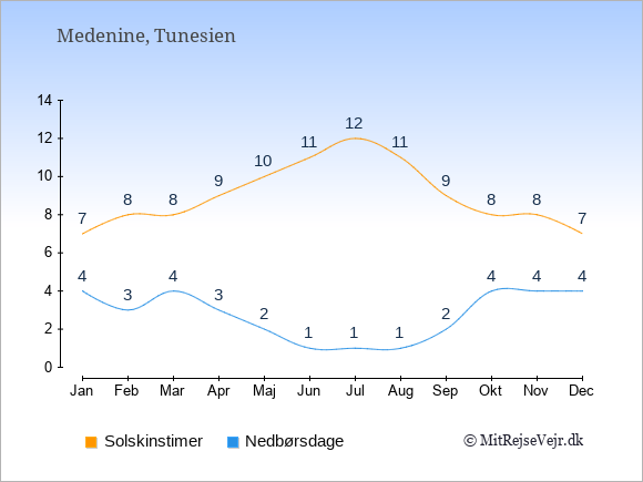 Graferne viser det gennemsnitlige antal solskinstimer i Medenine pr. dag samt det gennemsnitlige antal dage med nedbør i Medenine sammenlignet med København.