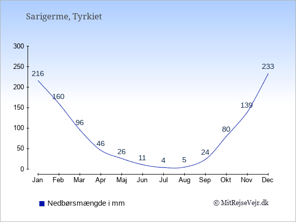 Se klimadata for Sarigerme sammenlignet med klimaet i Danmark.