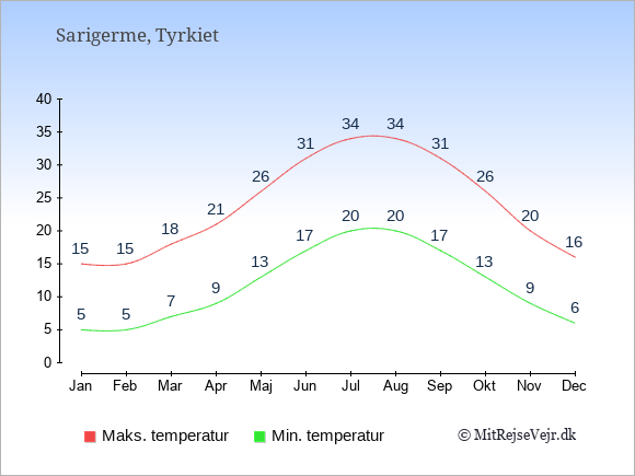 Graferne viser de gennemsnitlige maksimale temperaturer i Sarigerme og København (typisk når solen står højest på himmelen om eftermiddagen) og de gennemsnitlige minimale temperaturer (typisk den laveste temperatur som måles om natten).