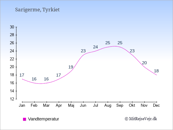 Her på siden kan du få et samlet overblik over det gennemsnitlige klima i Sarigerme måned for måned sammenlignet med klimaet i København. Oplysningerne om det historiske klima kan du bruge til at planlægge din ferie og finde det bedste tidspunkt at rejse til Sarigerme på.