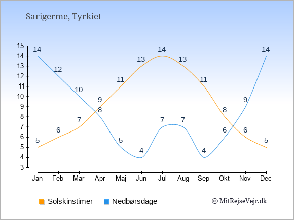 Skal man ud og rejse, har Sarigerme det bedste klima i de måneder, hvor der er mange solskinstimer og få nedbørsdage.