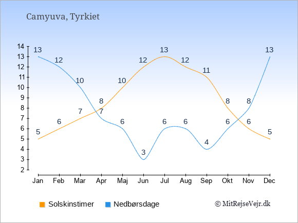 Grafen viser antallet af solskinstimer i Camyuva (d.v.s. det gennemsnitlige antal timer pr. dag hvor solen skinner), samt antallet af nedbørsdage (d.v.s. det gennemsnitlige antal dage i en given måned,