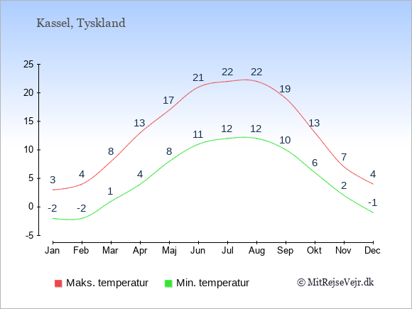Graferne viser de gennemsnitlige maksimale temperaturer i Kassel og København (typisk når solen står højest på himmelen om eftermiddagen) og de gennemsnitlige minimale temperaturer (typisk den laveste temperatur som måles om natten).
