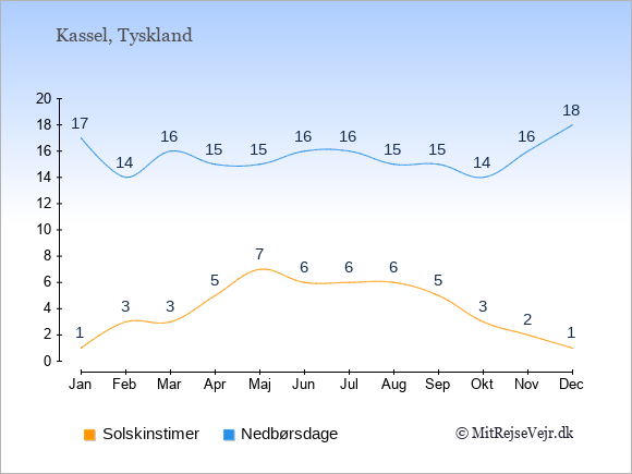 Graferne viser det gennemsnitlige antal solskinstimer i Kassel pr. dag samt det gennemsnitlige antal dage med nedbør i Kassel sammenlignet med København.