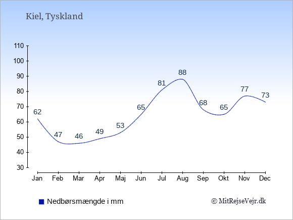 Grafen viser de gennemsnitlige maksimale temperaturer i Kiel (som oftest den værdi, der er målt midt på dagen) og de gennemsnitlige minimale temperaturer (som oftest den værdi, der er målt midt om natten).