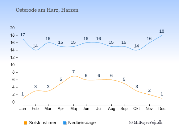 Grafen viser antallet af solskinstimer i Osterode am Harz (d.v.s. det gennemsnitlige antal timer pr. dag hvor solen skinner), samt antallet af nedbørsdage (d.v.s. det gennemsnitlige antal dage i en given måned,