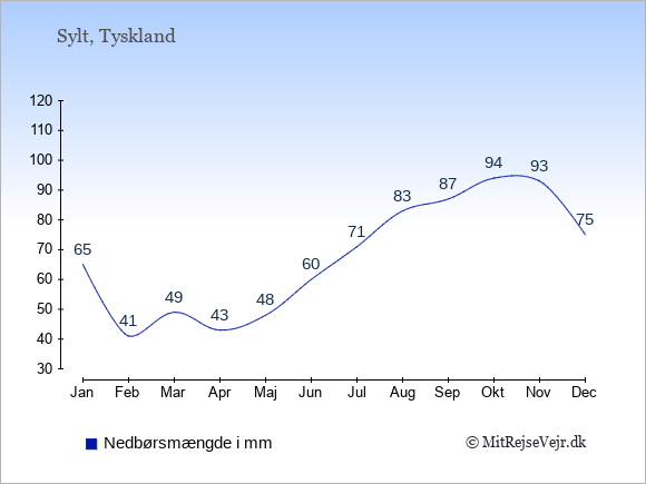 Hvis du vil se, hvordan vejret på Sylt adskiller sig fra vejret derhjemme, kan du sammenligne tallene måned for måned med de tilsvarende tal for Danmark under Sylt: klima & vejr.