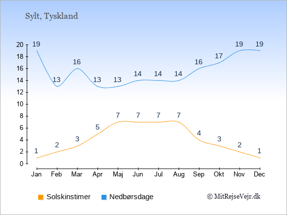 Grafen viser antallet af solskinstimer på Sylt (d.v.s. det gennemsnitlige antal timer pr. dag hvor solen skinner), samt antallet af nedbørsdage (d.v.s. det gennemsnitlige antal dage i en given måned,