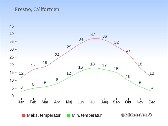 Graferne viser de gennemsnitlige maksimale temperaturer i Fresno og København (typisk når solen står højest på himmelen om eftermiddagen) og de gennemsnitlige minimale temperaturer (typisk den laveste temperatur som måles om natten).