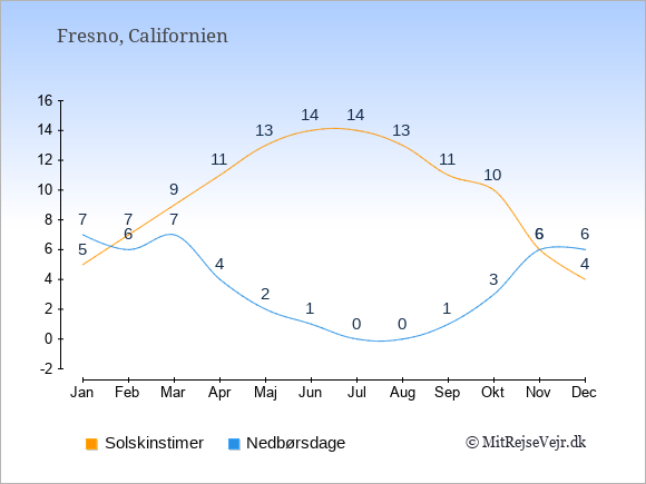 Graferne viser det gennemsnitlige antal solskinstimer i Fresno pr. dag samt det gennemsnitlige antal dage med nedbør i Fresno sammenlignet med København.