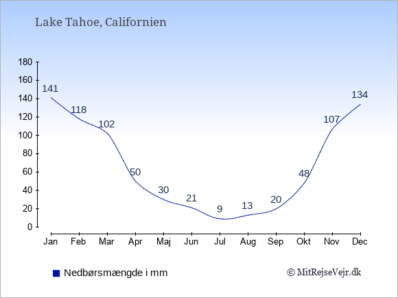 Se klimadata for Lake Tahoe sammenlignet med klimaet i Danmark.