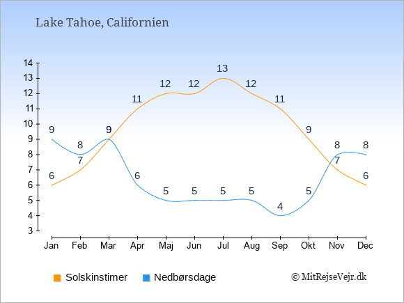 Graferne viser det gennemsnitlige antal solskinstimer i Lake Tahoe pr. dag samt det gennemsnitlige antal dage med nedbør i Lake Tahoe sammenlignet med København.